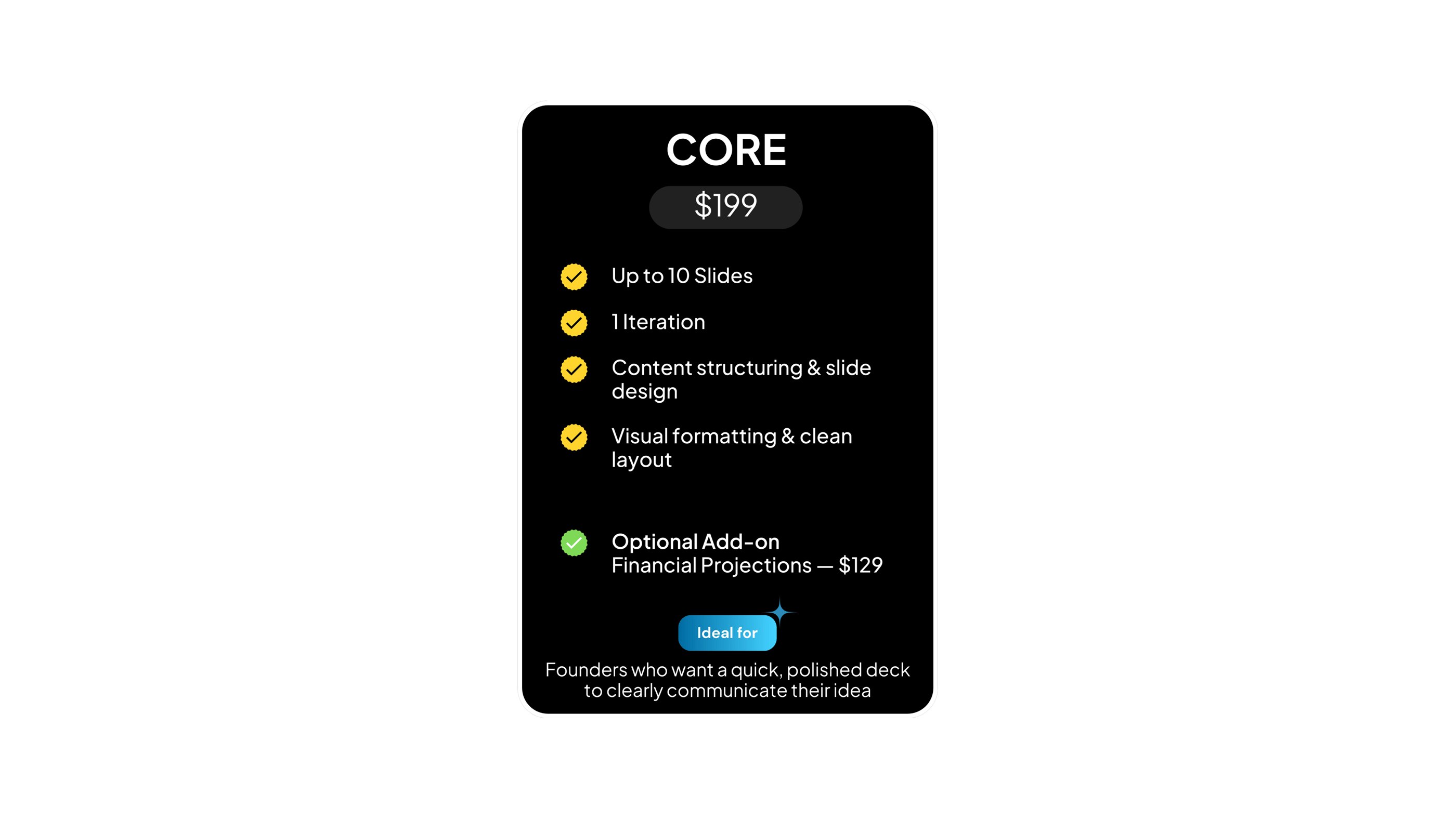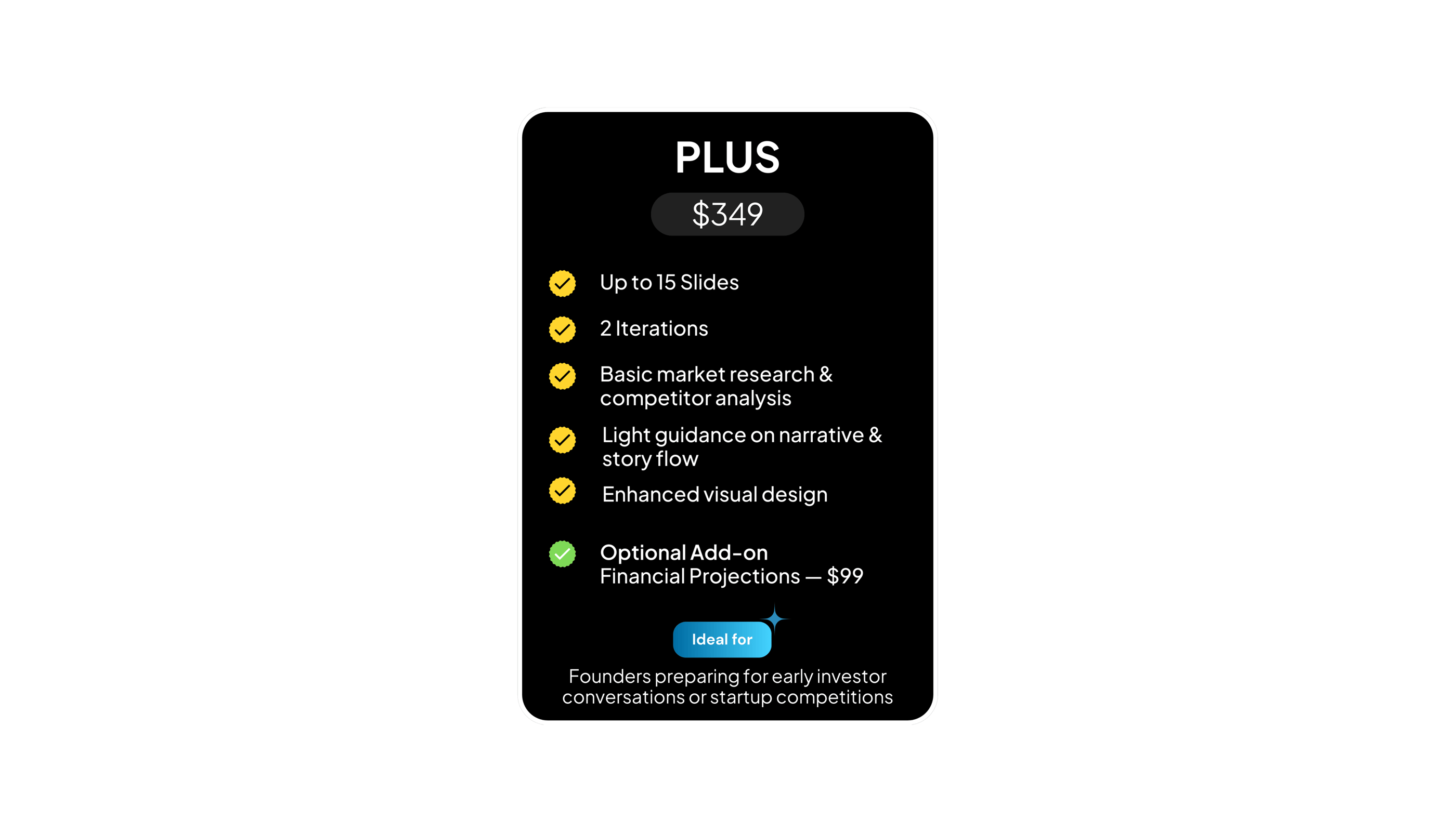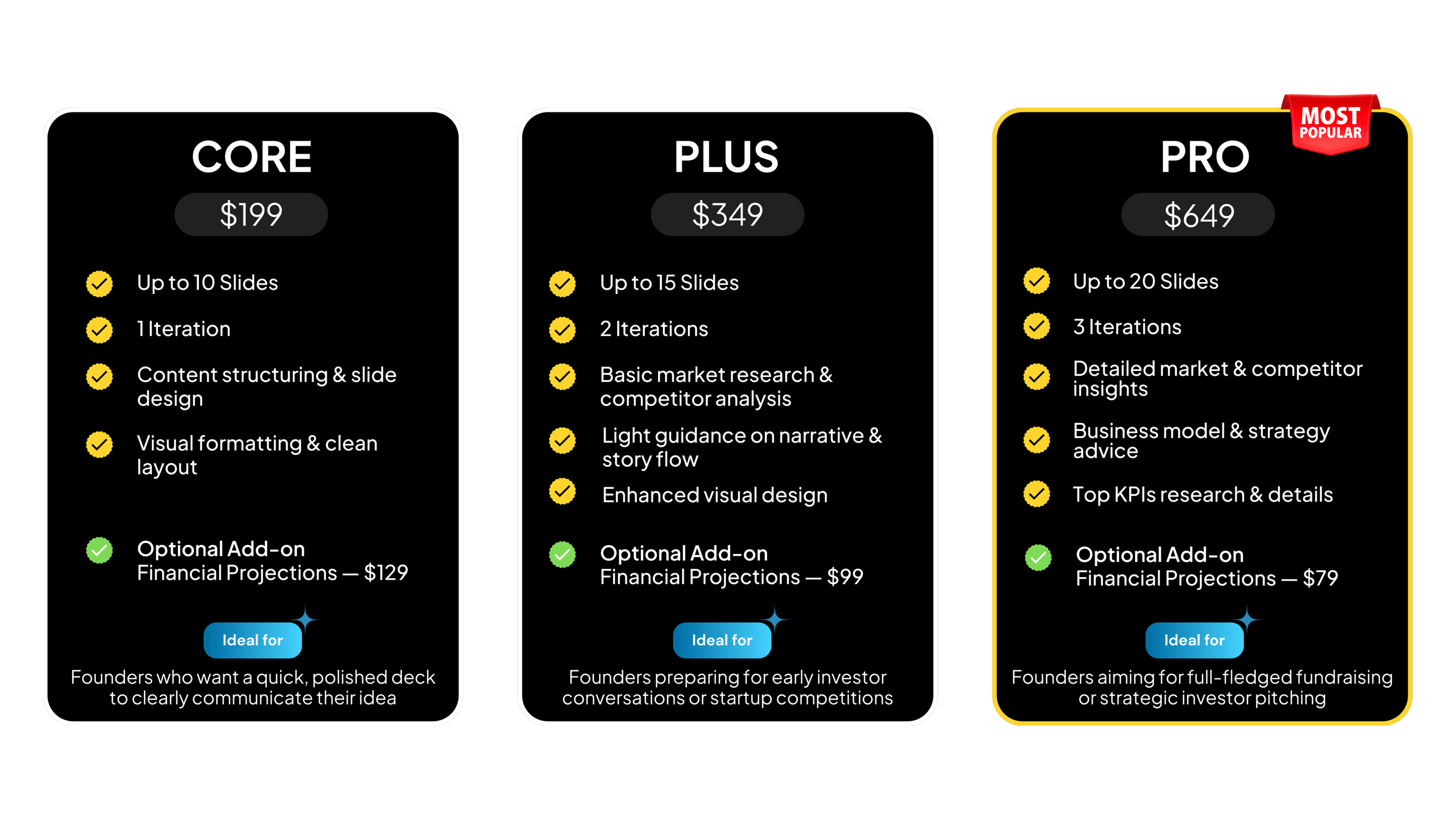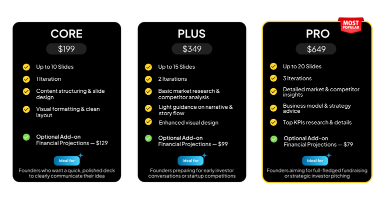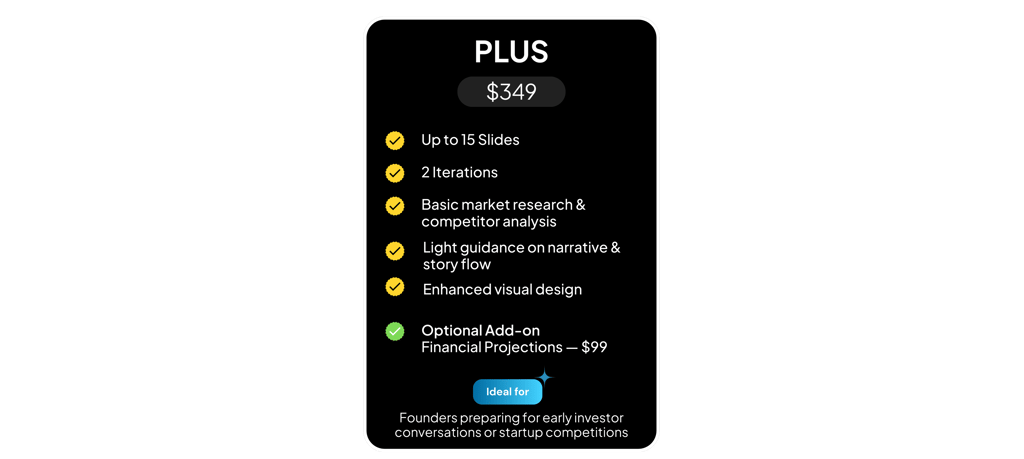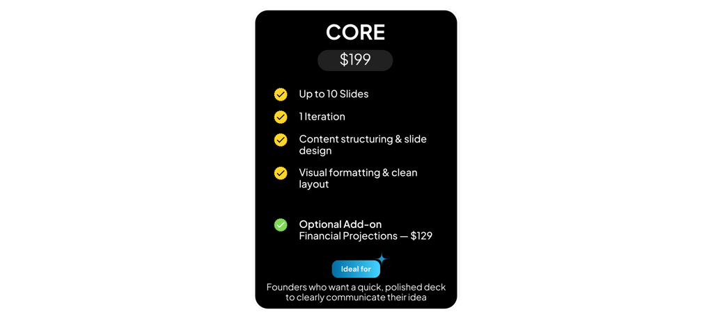 "They transformed my messy ideas into a structured deck and advised me on defining my revenue model."