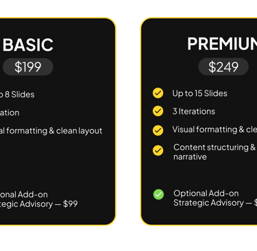 Strategy-led advisory and design support, where we act as your thinking partner across business insight, market clarity, and presentation.