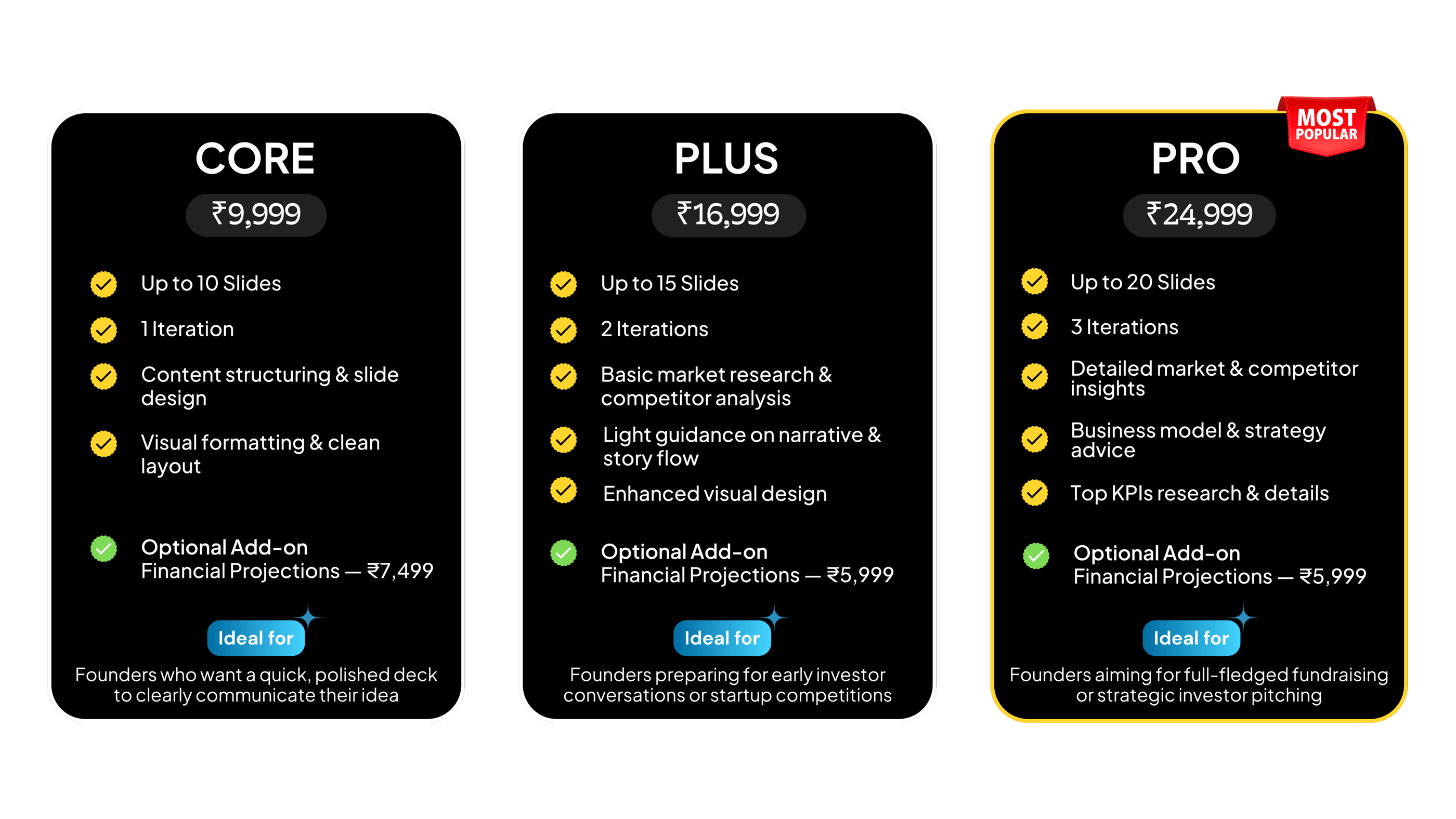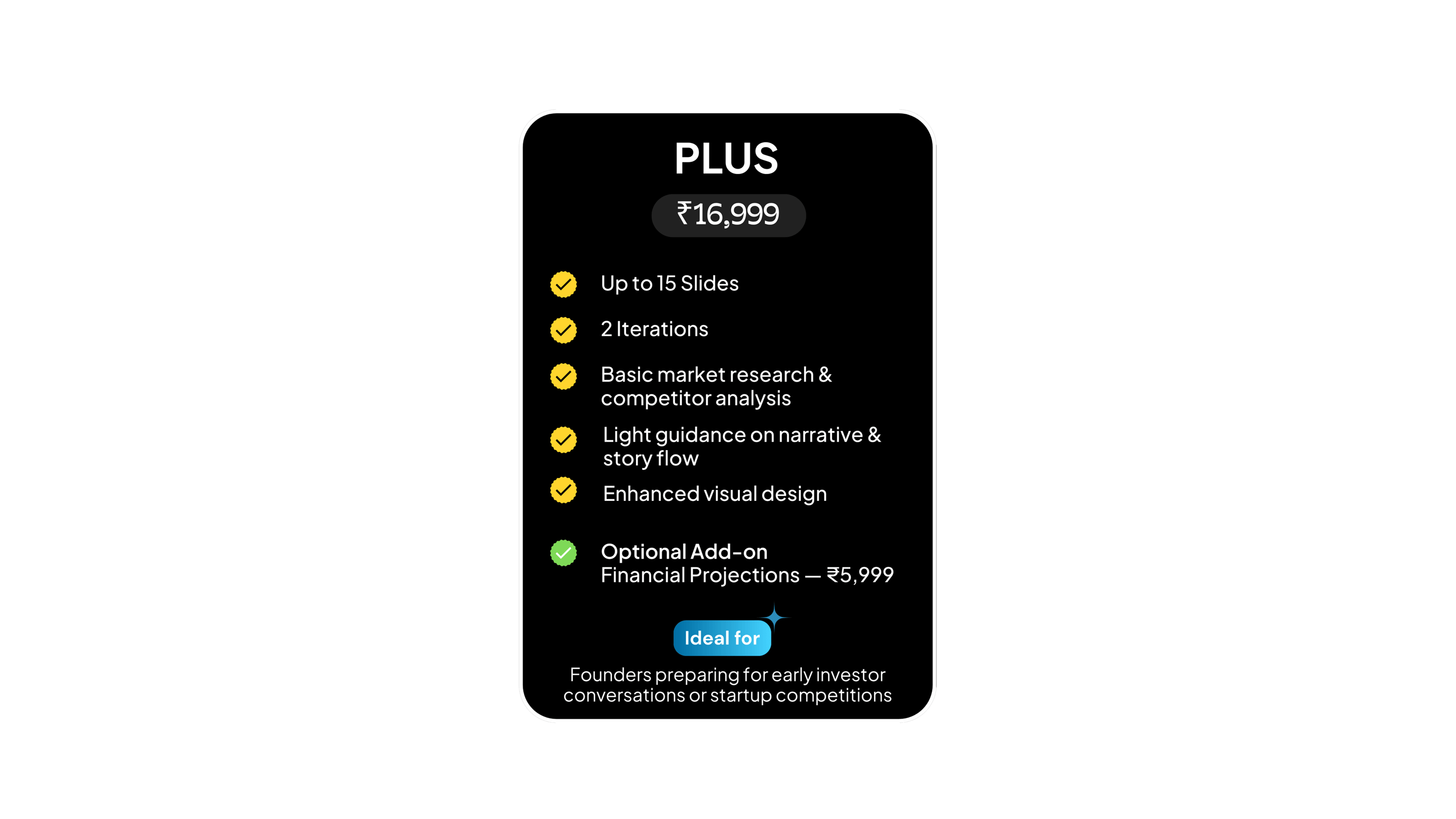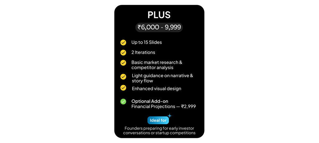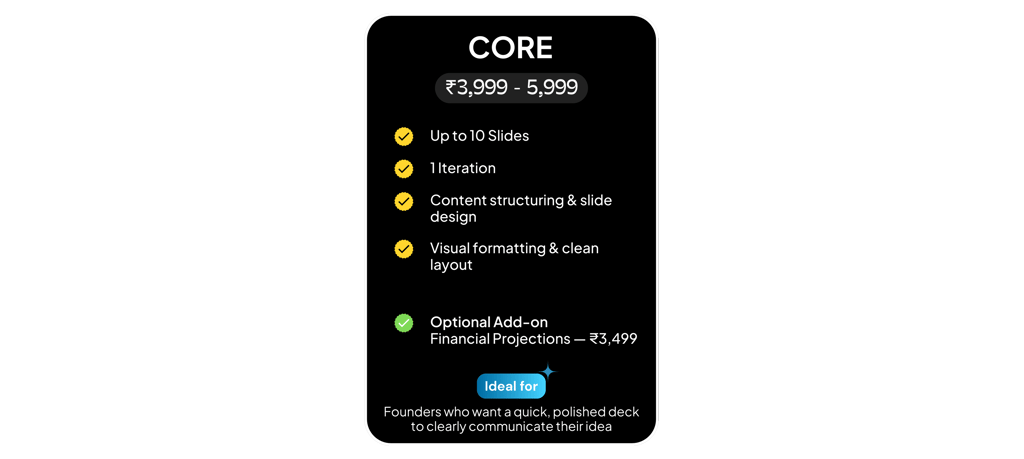 "They transformed my messy ideas into a structured deck and advised me on defining my revenue model."