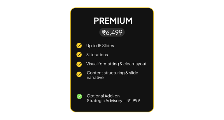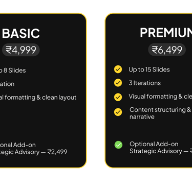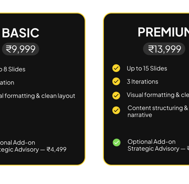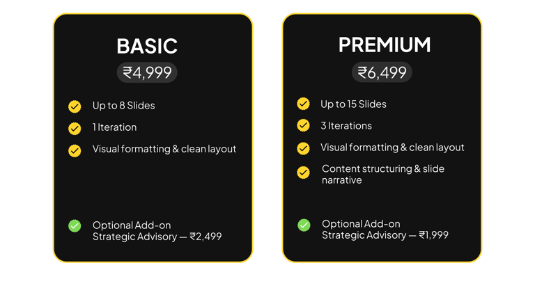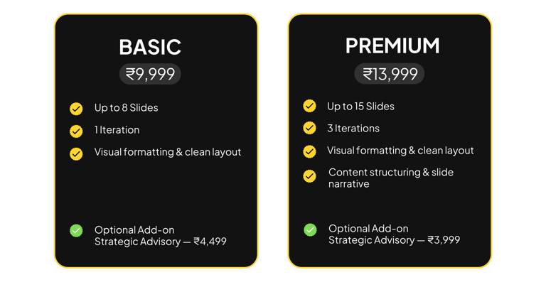 Strategy-led advisory and design support, where we act as your thinking partner across business insight, market clarity, and presentation.