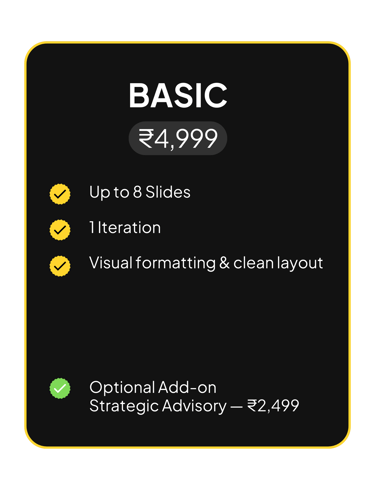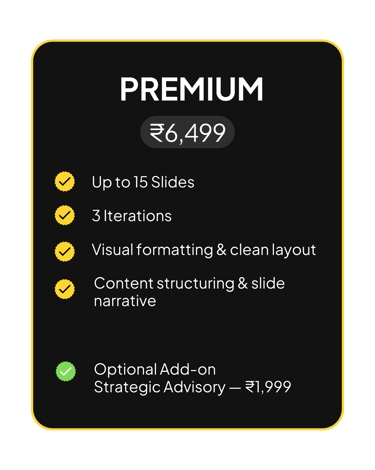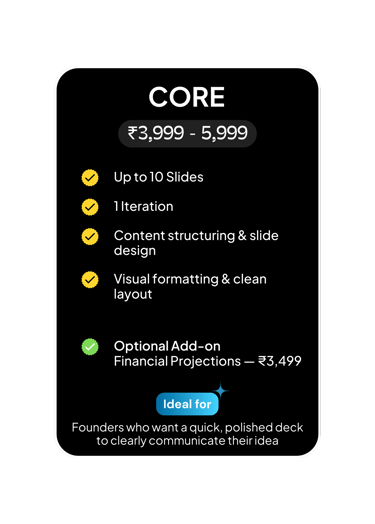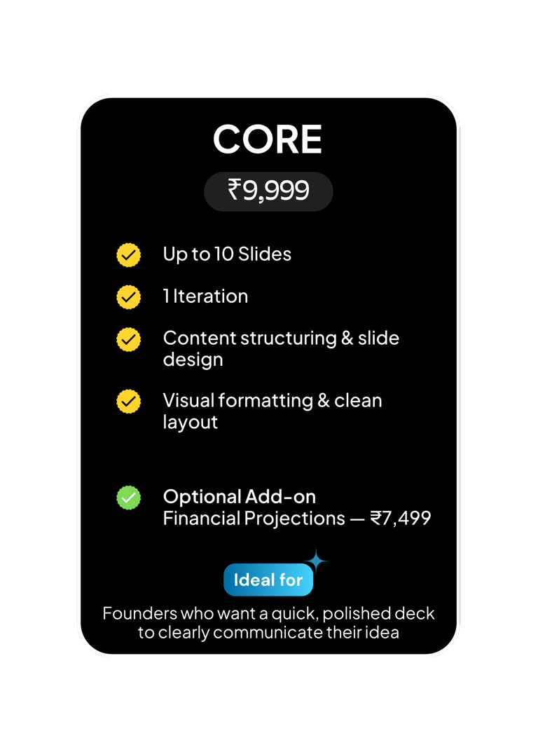 Deckorae is a strategic pitch-deck and business advisory studio designed exclusively for early-stage founders. We help young ideas gain the confidence, clarity, and conviction needed to engage investors, advisors, and clients.